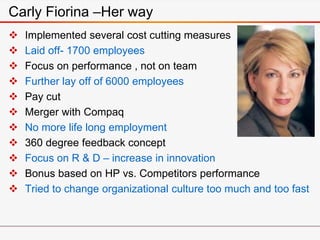 She does what she does for others. Hp - Carly Fiorina Leadership. As a matter of fact she was so job focused and driven that a year after she arrived as CEO of HP she unveiled plans for a major reorganization.